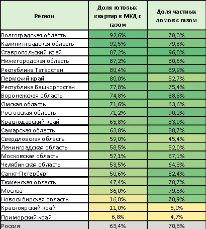 Наименьший уровень газификации как квартир в МКД, так и загородной недвижимости, – в ряде регионов Дальнего Востока и Сибири, в частности, в Приморском крае. В этом дальневосточном регионе газификация была запущена относительно недавно, но идёт активными темпами. В результате сложилась ситуация, когда в некоторых многоквартирных домах, изначально спроектированных под электрические плиты, газ подведён к каждому подъезду, но собственники квартир не спешат подключать его.
