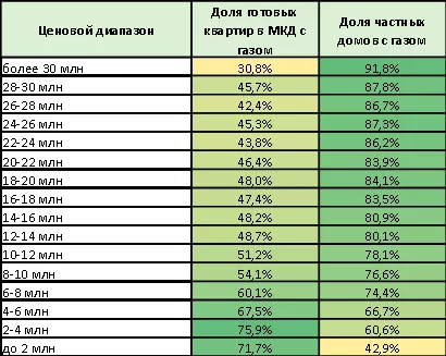 На данный момент на российском рынке недвижимости сложилась ситуация, когда загородные дома, выставленные на продажу чаще газифицированы, чем вторичная недвижимость, находящаяся в многоквартирных домах (МКД). Среди частных домов и таунхаусов доля с подведенными газовыми коммуникациями достигла 71%, а на рынке вторичной недвижимости в МКД – 63,4%.
